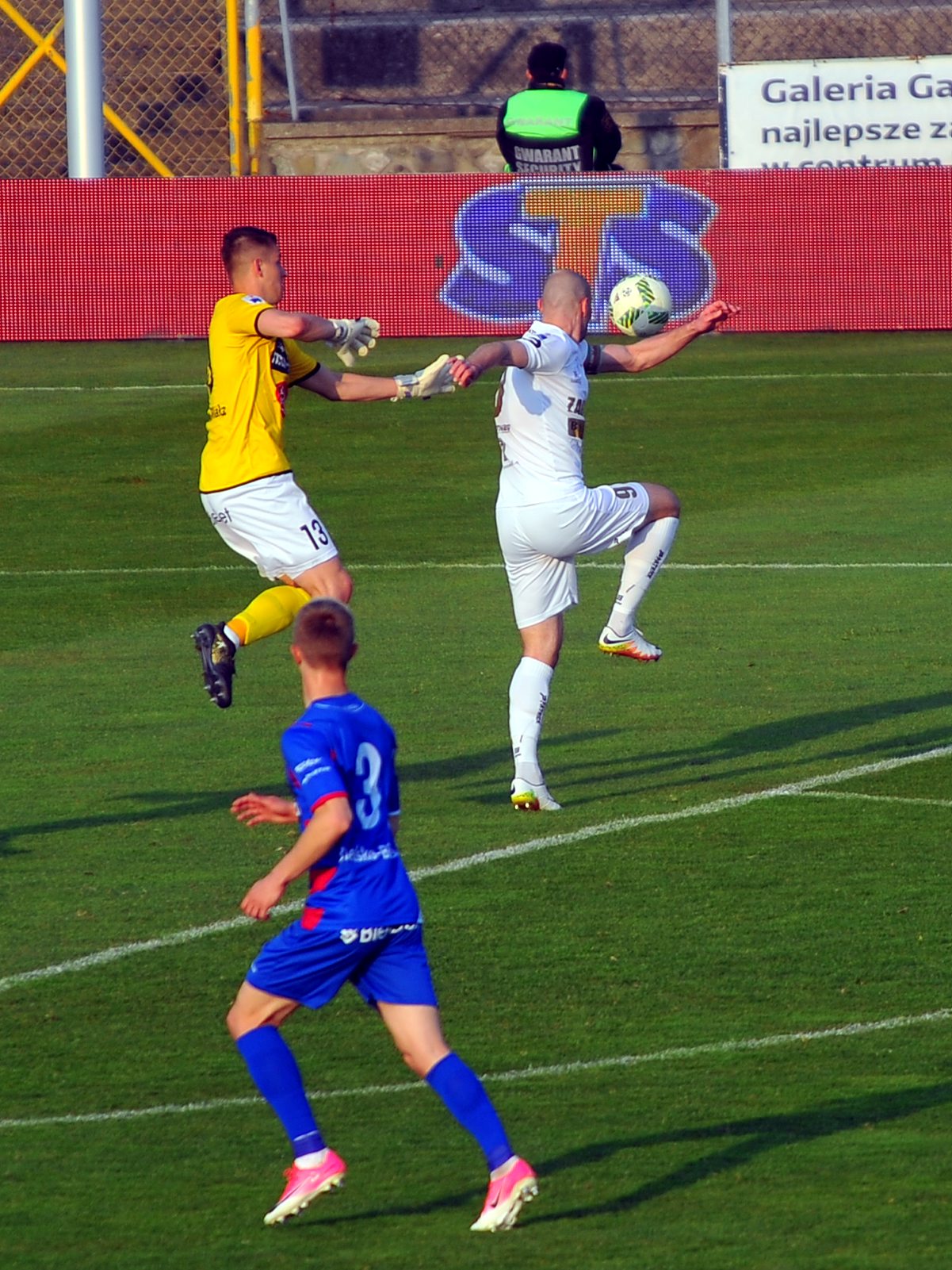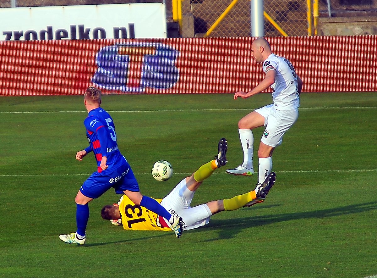 Około 2 tys. widzów zjawiło się na bardzo ważnym meczu na Stadionie Ludowym z zespołem Podbeskidzia Bielsko Biała. Oba zespoły rozpoczęły bardzo ostrożnie i z respektem dla rywala. Na trybunach również nadzwyczaj spokojnie. Tylko kilkunastoosobowa grupka kibiców z Bielska dała znak swojej obecności. Dopiero w 27 minucie nastąpiło lekkie ożywienie, najpierw po tym jak Michał Fidziukiewicz zawalczył o długą piłkę z bramkarzem gości, potem po ładnym strzale z wolnego pod poprzeczkę Wojciecha Łuczaka sparowanym na róg. Pod koniec pierwszej połowy było jeszcze kilka dość nieporadnych prób przedostania się pod pole karne Podbeskidzia i to właściwie wszystko, co można powiedzieć o dość mizernej grze obu zespołów w pierwszej części meczu.