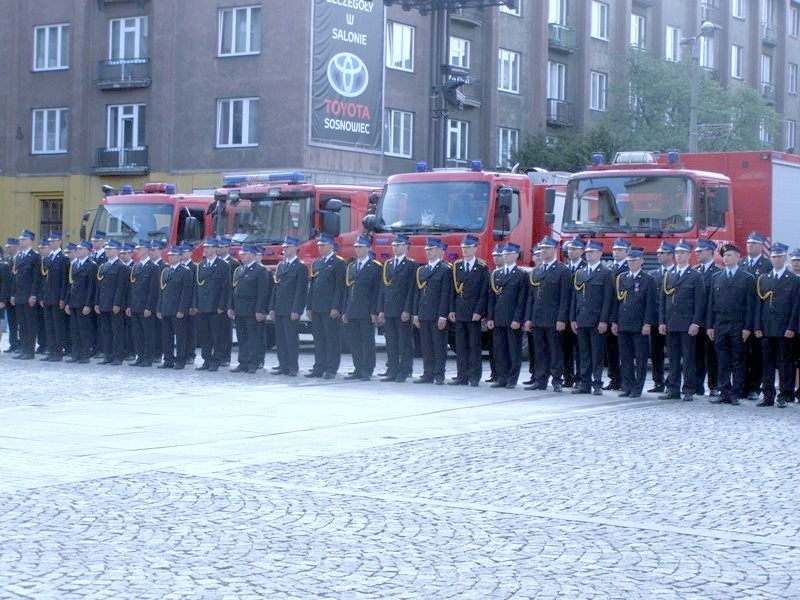 Zastępy strażaków wraz z wozami bojowymi zaprezentowały się przed Urzędem Miejskim niczym na defiladzie. Był też strażacki wóz drabiniasty. Kompania honorowa uroczyście przypięła do drabiny flagę narodową, która następnie została uniesiona w górę. Gdy flaga już swobodnie powiewała na wietrze, Komendant Miejski PSP w Sosnowcu, st. bryg. mgr inż. Grzegorz Nowak, przywitał wszystkich gości. Przybyli posłowie, radni, reprezentanci różnych służb mundurowych (Ochotnicza Straż Pożarna, Straż Miejska, Policja), duchowni, emerytowani strażacy, sympatycy pożarnictwa i mieszkańcy.