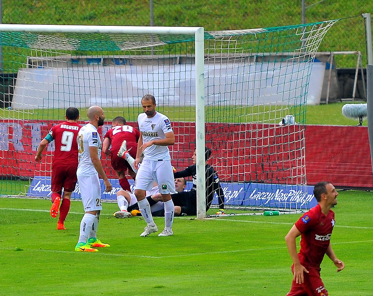 W dogrywce oba zespoły zaczęły grać uważniej. W 9 minucie dogrywki miała miejsce kolejna dziwna decyzja arbitra, który pokazał czerwoną kartkę Żarko Udovicicowi. Po tym osłabieniu goście długimi okresami oblegali nasze pole karne. Nieszczęście nastąpiło 4 minuty po rozpoczęciu drugiej części dogrywki. W naszym polu karnym ręką zagrał Łukasz Matusiak i sędzia wskazał na jedenastkę, którą pewnie wykorzystał Denis Popovic. Na wyrównanie naszych bardzo zmęczonych piłkarzy już nie było stać., Ale słowa uznania należą się piłkarzom Zagłębia za bardzo ambitną postawę. Sędzia tego meczu nie stanął na wysokości zadania.
