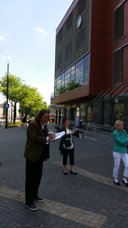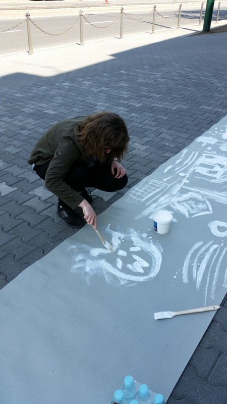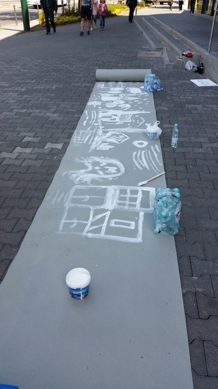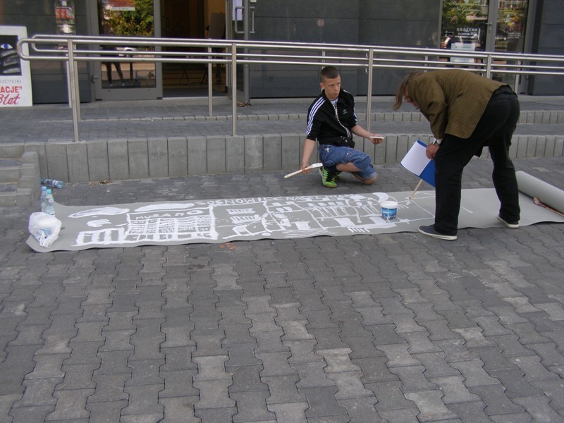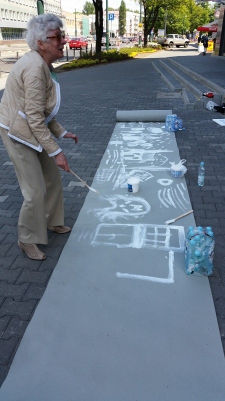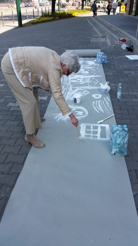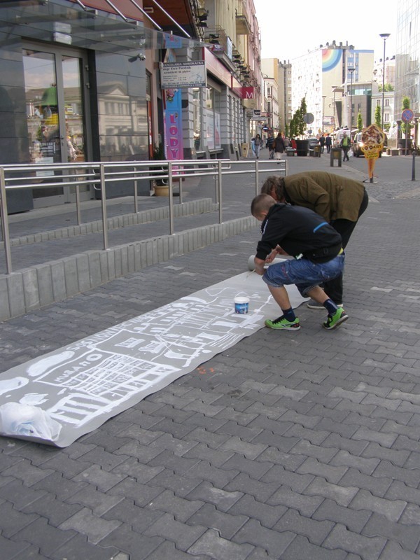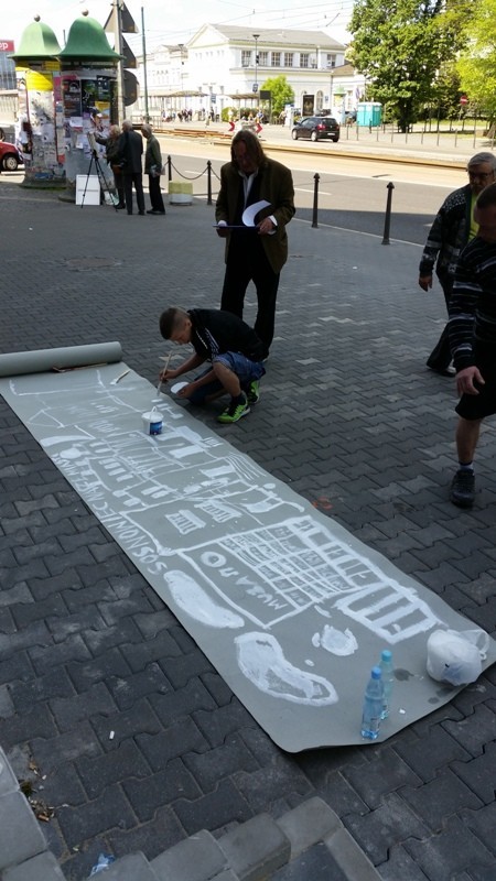 Mistrz grupy Czesław Gałużny wygłosił kilka słów zachęty do swoich podopiecznych, jak i do grupy dzieci chcących zostać w przyszłości profesjonalistami. Następnie wszyscy biorący udział w akcji rozeszli się po centrum Sosnowca rozstawiając się z sztalugami w różnych miejscach. Sam Czesław Gałużny zajął stanowisko przed Muzą rozwijając dużą rolę szarego papieru, na której malował białą farbą i zachęcał do tego samego wszystkich mieszkańców.